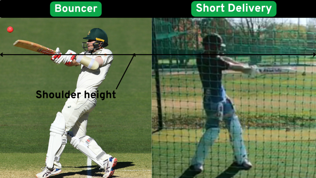 A bouncer usually passes above the shoulder height of a batter, whereas a short-pitched delivery constitutes any cricket ball (regardless of height) that causes the batter to play the ball off the back foot.